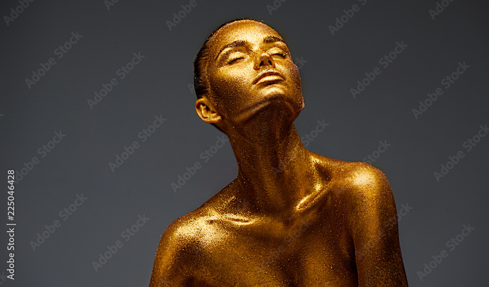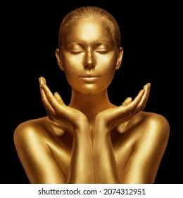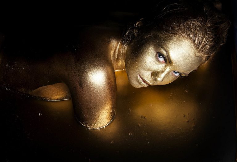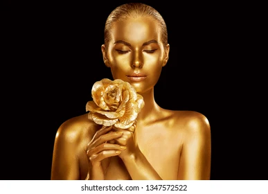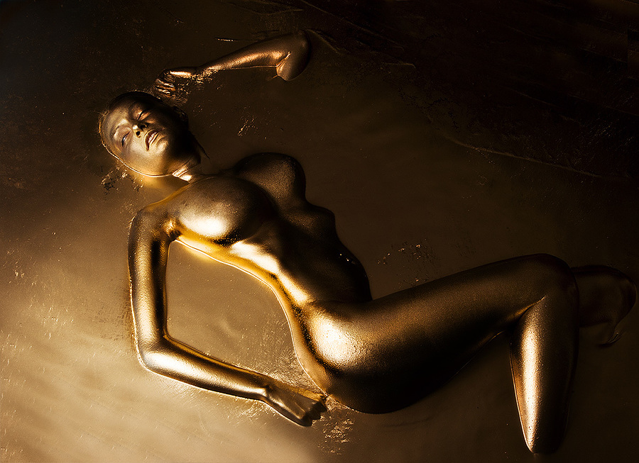 This concept explores gold in its purest visual form: rich, molten, reflective. The first chapter of the shoot centres on the body as sculpture, using sprayed gold body paint, applied in the same way as a professional tan, to create a flawless, luminous finish. The result is smooth, even and radiant — skin transformed into liquid metal.